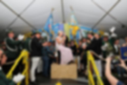 Gegen 24 Uhr darf er dann auf einem Holzstuhl hoch oben auf einem Podest Platz nehmen. Nach und nach sägt die Fahnensektion die Stuhlbeine ab. Nach einem schönen Jahr geht die Königszeit dann zu Ende. Hierbei kann sich so manch einer das eine oder andere Tränchen nicht verdrücken.